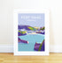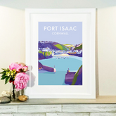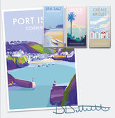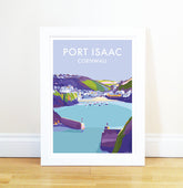 Port Isaac travel poster and seaside print by Becky Bettesworth. Port Isaac is part of Becky Bettesworth's vintage style collection of travel posters and seaside prints which are reminiscent of a bygone era, celebrating the natural beauty of the UK coastline.