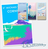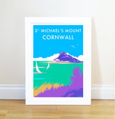 Becky Bettesworth's vintage-style seaside prints and posters are reminiscent of the classic 1930s railway travel posters. St Michaels Mount is a small island off West Cornwall and forms part of her seaside collection from the award-winning Westcountry artist. The island with its medieval church and castle is managed by the National Trust and is accessible by a granite causeway at low tide. Becky has cleverly used vibrant colours to bring the magic of the island alive in its stunning setting in Mounts Bay.
