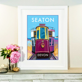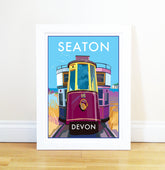 Becky Bettesworth's vintage style prints and posters are reminiscent of the classic 1930s railway travel posters and the tramway at Seaton fits perfectly into her style and bygone era. Becky is an award-winning local artist from Devon and loves the beauty and unspoilt charm of the tramway which is nestled in the Axe Valley in East Devon. The vibrant No.16 British tram car captured in its' original classic colours of crimson and yellow was built in 1920 and is still in operation to Colyford and Colyton.