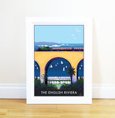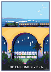 The English Riviera Steam Train Print and Poster by award winning Devon artist Becky Bettesworth celebrates the mighty Goliath on the Dartmouth Steam Railway, crossing Hookhills Viaduct with Broadsands beach huts below and Torquay in the far distance.