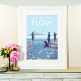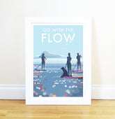 Becky Bettesworth's Go With The Flow vintage style quote poster and print shows Becky's love for Paddle Boarding and is set down at Meadfoot Beach which is one of her local beaches down the road from her home in Torquay, South Devon, with the iconic Thatchers Rock in the background.