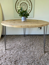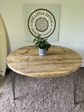 Create a warm and inviting dining space with this one-of-a-kind round dining table, handcrafted from reclaimed wood and finished with sleek, industrial hairpin legs. Designed to blend rustic charm with modern elegance, each table is a true original, showcasing the natural grain, knots, and character of the wood’s past life.
