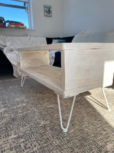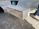 A recent addition to our wooden coffee table family. This amazing wooden coffee table looks absolutely stunning at a height perfect for your feet to rest on after that long hard day. It has a top which is perfect for you coffee’s and magazines, and then has underneath storage for all the bits and pieces you need to store away for rainy days. It comes with a choice of colours for the hairpin legs, the ones pictured are white with a whitewash finish.
