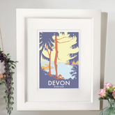 River Dart (trees) forms part of Becky Bettesworth's stunning vintage-style seaside collection of prints and posters from the Westcountry. Local artist, Becky, has a series of pictures set on the River Dart which are inspired by the classic 1930s railway and travel posters. This picture looks down through the trees, set up high on the bank of the river, and the mellow colours Becky has used capture the calm and mellow mood.