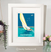 Becky Bettesworth's vintage style prints and posters are reminiscent of the classic 1930s railway travel posters. Paignton (sailing boat) forms part of her Westcountry seaside collection by the Devon-based award-winning artist. Right in the centre of The English Riviera, Paignton boasts ideal sailing conditions across Torbay and you can almost feel the salt in the sea air with this picture! Right on her doorstep, Becky never tires of this scene whether walking her dog Squiggle, looking out to the beach huts and pier beyond, or playing on the beach with her children.